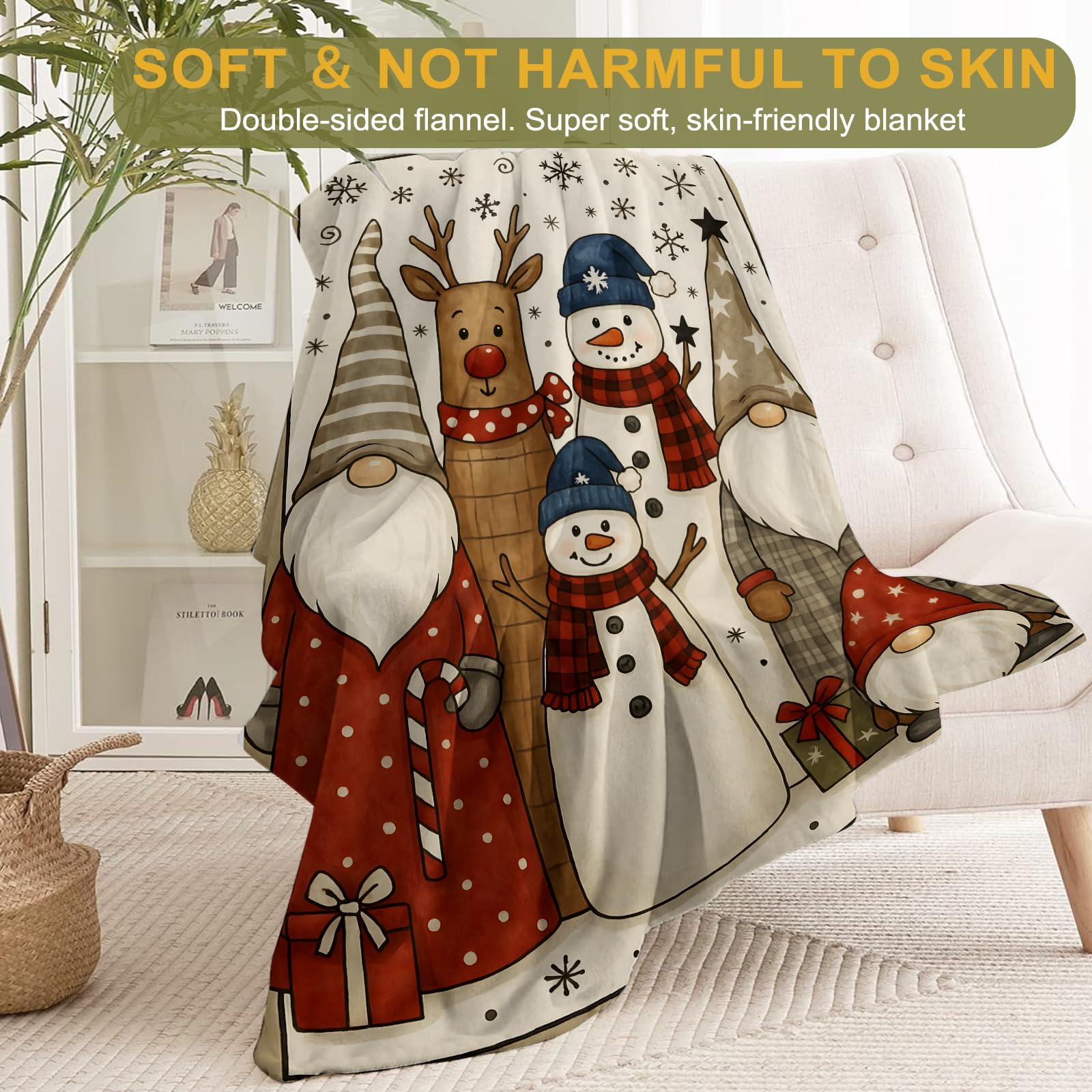 - 【Festive Holiday Illustration】The blanket features a delightful Christmas design with playful gnomes, snowmen, and a reindeer all dressed in cozy winter attire. Accented with snowflakes and wrapped gifts, the image adds a whimsical and heartwarming charm that instantly brings holiday spirit to your home.