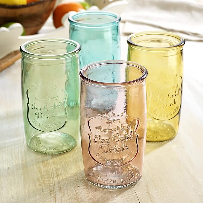 Glaver's Colored Glassware, Ice Cold Drinking Glasses Set of 4 – 18 Oz Vintage Glass Cups for Kitchen, Dining Table – Multi- Colors Glass Tumblers. Hand Wash.
