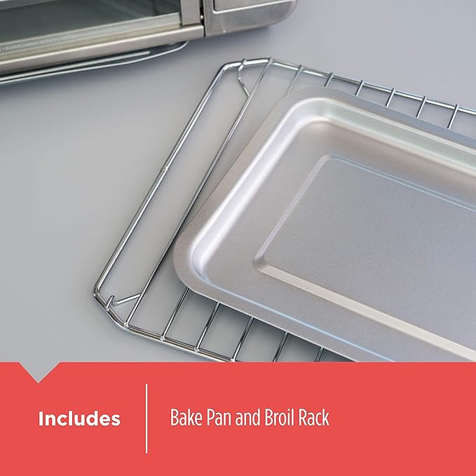 - CLEAR-VIEW GLASS DOOR: The large glass door lets you keep an eye on food during cooking; Bake Pan, Removable Crumb Tray, Rack Included with non-stick interior