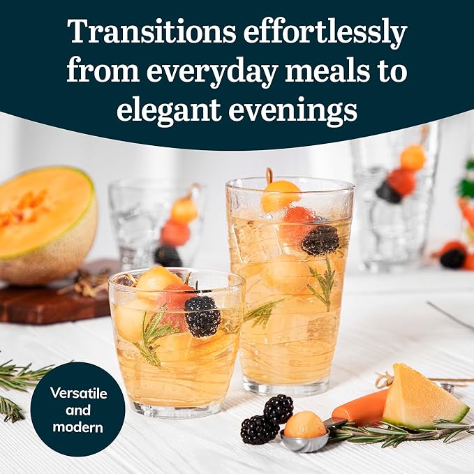 - Unique Wave Pattern: This durable drinking glasses set of 16 boasts a unique wave pattern; this unique pattern gives everyday drinking glasses a fun and quirky aesthetic as you hold them comfortably in your hand