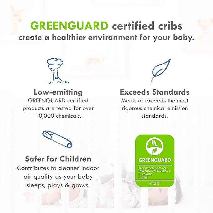 - GREENGUARD Gold Certified: Our baby cribs 4-in-1 convertible is tested for 10,000+ chemical emissions. Finished with a non-toxic painting process, lead and phthalate-safe, our baby beds ensure a clean, healthy space for your baby to sleep, play, and grow.