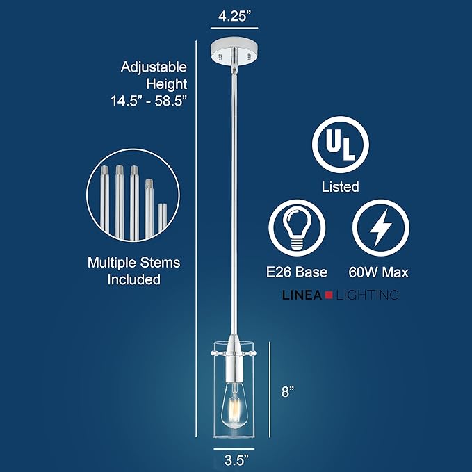 - COMPATIBLE WITH MOST STANDARD MEDIUM BASE BULBS - This chrome kitchen pendant light fixture comes with medium clear glass shade that has a diameter of 3.5" and a height of 8"