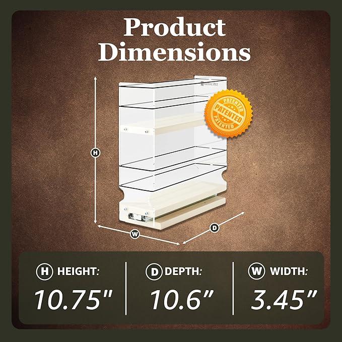 - OPTIMAL SIZE FOR EFFICIENT STORAGE: Featuring 2 tiers measuring 3.45" x 10.75" x 10.6", this sliding spice rack organizer offers ample space to store your spices and kitchen essentials. Its compact yet functional design ensures efficient use of space without compromising on storage capacity.