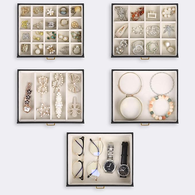 - 5 removable drawers for maximum jewelry storage. The deeper bottom drawer has only one compartment. Its size is 7.31"L x 5.81"W x 2.25"H. The other 4 drawers have the equal size. Their size is 7.31"L x 5.81"W x 1.00"H. Drawer 1 has 20 equal size compartments; Drawer 2 has 12 equal size compartments; Drawer 3 has 4 equal size compartments; Drawer 4 has just one compartment.