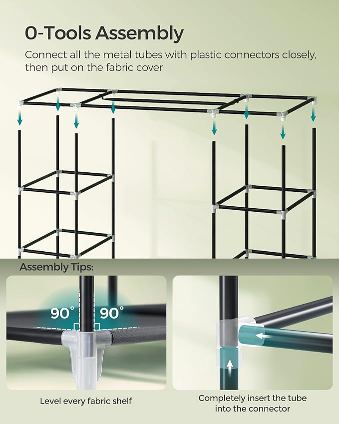 - [Easy Assembly] No tools required. Just follow the instructions and insert the tubes into the plastic connectors, then you can finish the assembly of this clothes storage organizer effortlessly. Also, spare parts are provided for replacement