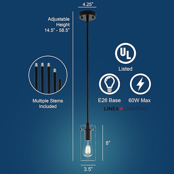 - COMPATIBLE WITH MOST STANDARD MEDIUM BASE BULBS - This matte black kitchen pendant light fixture comes with medium clear glass shade that has a diameter of 3.5" and a height of 8"