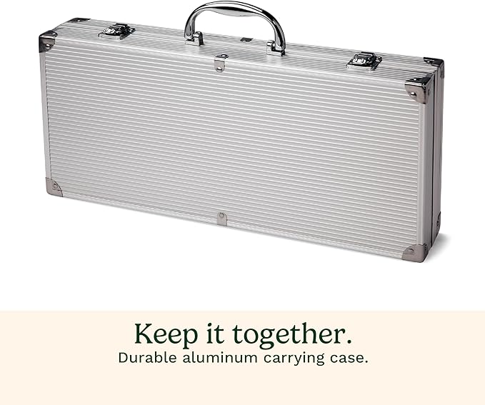 - ALUMINUM CARRYING CASE: Our sturdy, stylish and compact aluminum carrying case is perfect for easy transport and organized storage of all your grilling accessories for outdoor grills