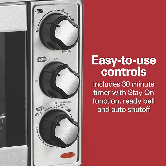- EASY-TO-USE CONTROLS: This toaster oven has simple controls that are easy to use. Perfect for anyone who wants a toaster oven that gets the job done without being complicated. Includes 30 minute timer with Stay On function, ready bell and auto shutoff.