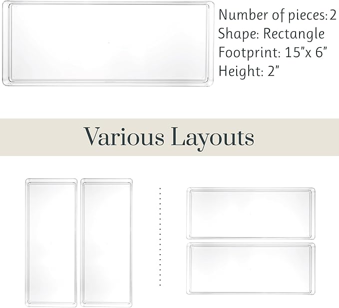 - This comprehensive set includes two meticulously crafted 15-inch by 6-inch shallow drawer organizers, designed to accommodate your essentials with precision. And with additional sizes available, you have the freedom to expand your organizational arsenal to tackle any cluttered drawer with finesse.