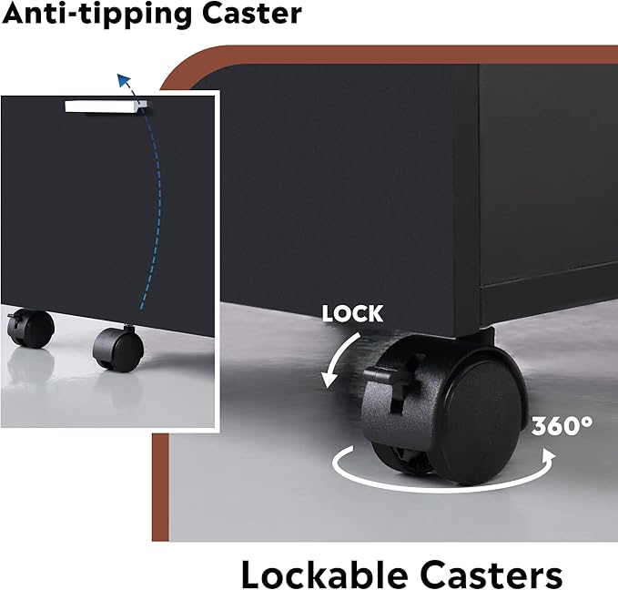 - DURABLE CASTERS: 5 rolling casters which can move smoothly on both wooden floor and carpet. With front 2 lockable breaking wheels, makes office supply rested on top, like printer. Middle casters prevents tipping over when all drawers opened at the same time.