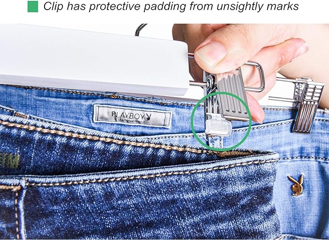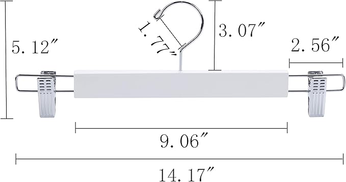 - 【NON SLIP & ADJUSTABLE CLIPS】2 pant clips grip clothes with strength, top with small grooves for easy opening and closing; clip has protective padding from unsightly marks; slides easily to fit different widths of clothing.14.17" when clips are stretched out, good for wider clothing; 9.06" when pushed in, perfect for smaller sized clothing.