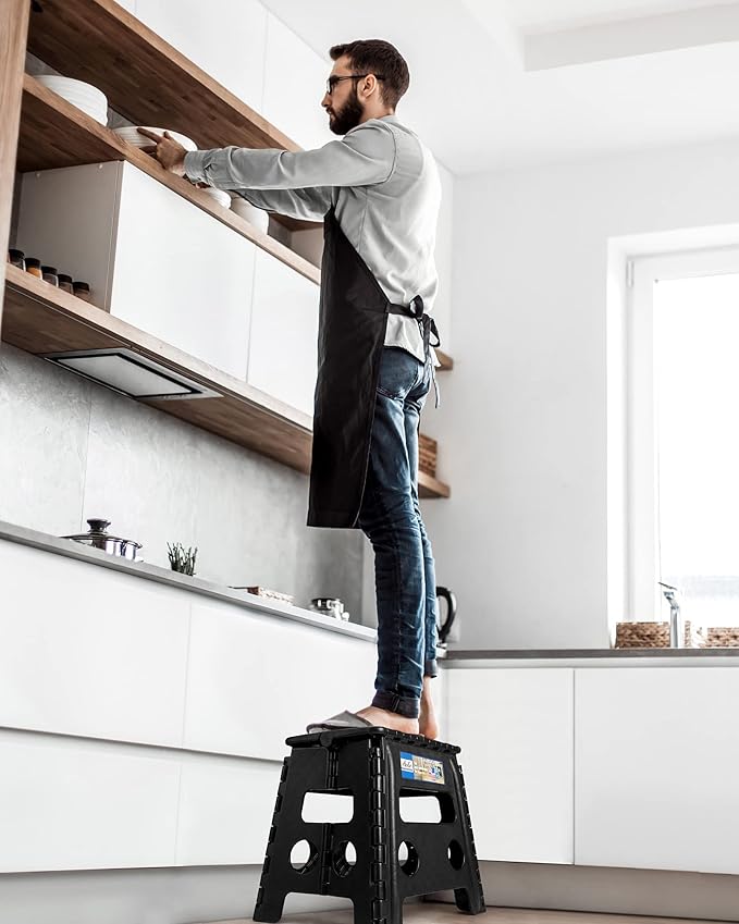 - Anti Slip - Rubber grips on the surface and anti-slip rubber feet on each foot create maximum grip, has amazing support and comfort. Unique grip-dot textured surface makes the folding step stool safe for everyone, including kids. These safety features make the step stool great for multipurpose uses i.e. kitchen, bathroom, dining room, office, garden, camping, fishing, and more.