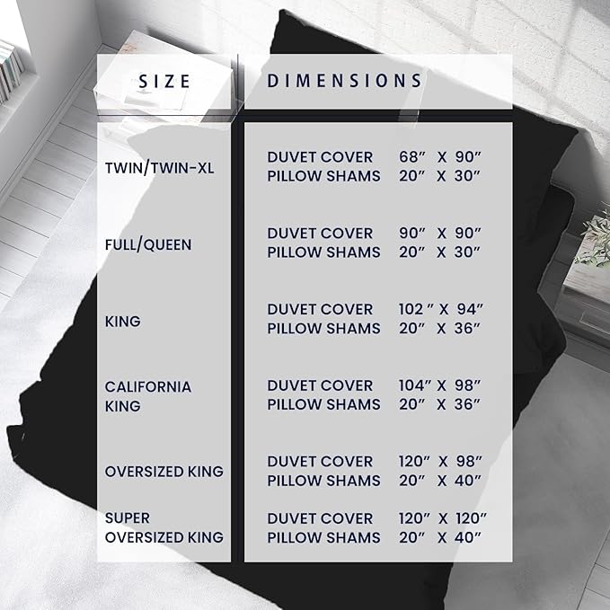 - KING SIZE DUVET COVER – LUXURY HOTEL QUALITY: Includes 1 King Duvet Cover (102" X 94") and 2 Pillow Shams (20" X 36") for a perfect fit. Comforter not included. Please measure your insert before purchasing.