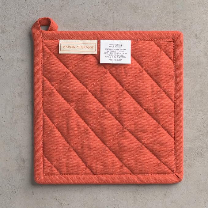 - Package Includes: Set includes 2 pot holders measuring 8" x 8", perfect for handling hot pots, pans, and dishes safely. Made from 100% cotton for reliable heat protection and durability. Designed in Europe and made in India