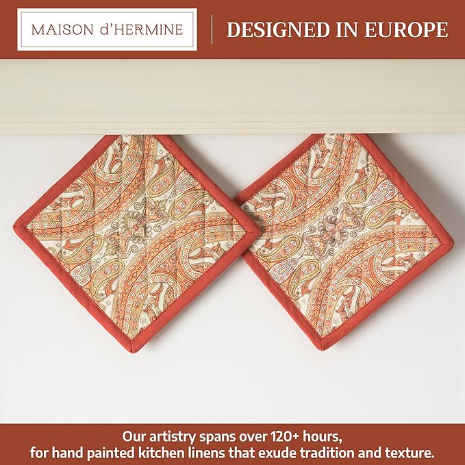 Maison d' Hermine Pot Holders Set 100% Cotton Heat Resistant Potholders 8" x 8" Hot Pads with Loop for Thanksgiving Christmas Decorations BBQ Baking Handling Hot Pans (Pack of 2, Kashmir Paisley)