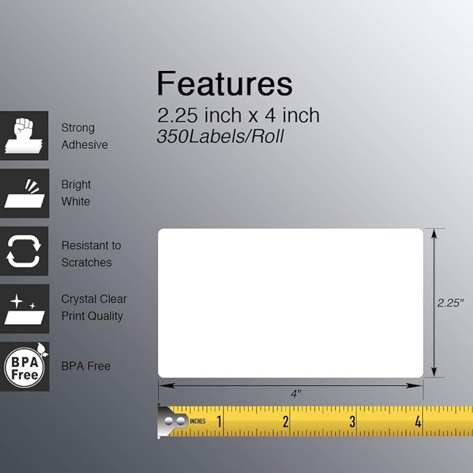 - [ Specifications ]: 2.25 in x 4 in (57 mm x 102 mm) (350 Labels/Roll, 6 Rolls),Paper tube diameter:1"(25.4mm). No Ink Toner or Ribbons Needed! Save your money and effort.