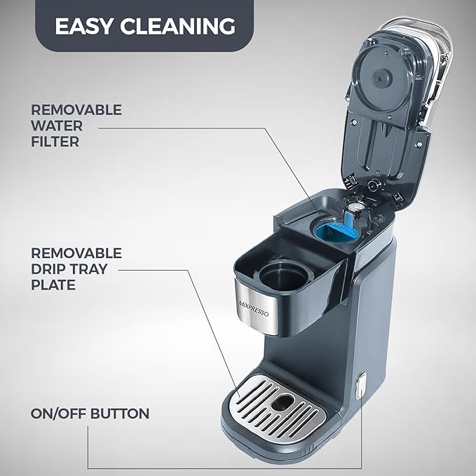 Mixpresso Single Cup Coffee Brewer - Quick Brew, One Touch Function, 12oz One Cup Grey Coffee Maker