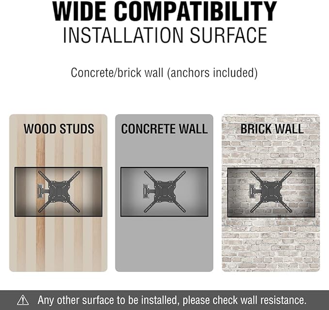 - FULL MOTION TV WALL MOUNT DESIGNED FOR OVERSIZED TVs: This articulated TV wall mount is designed from 26" up to 65" TVs and is rated for TVs up to 66.1lbs/30kg. It has a compatible faceplate that fits VESA size 2.9x2.9 in to 15.74x15.74 in (HxV). When retracted, this model has a unique slim profile design - your TV will look like a paint on the wall !