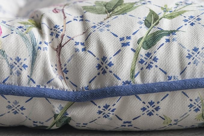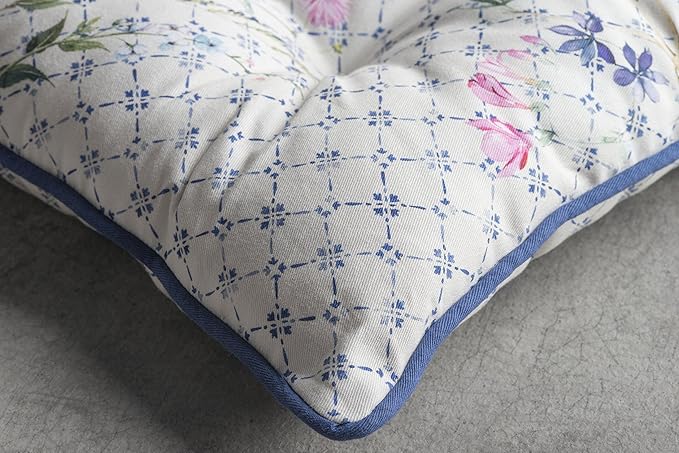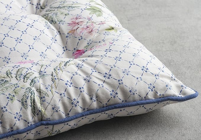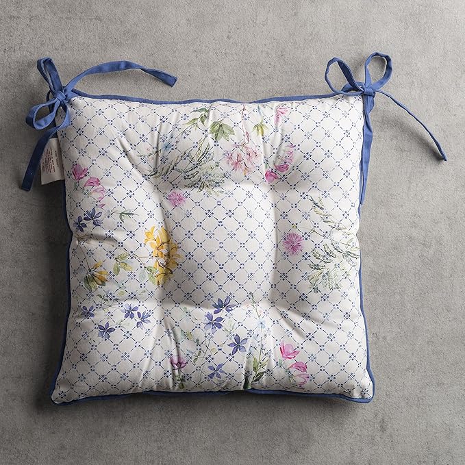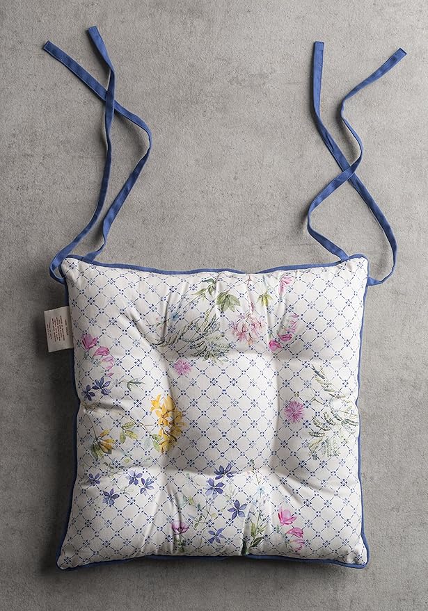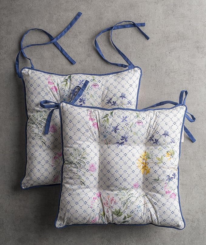 - Complete Package: Set includes 2 cotton chair cushions with ties, each 16"x16". Designed in Europe and made in India, these decorative seat pads add comfort and charm to any chair in your home