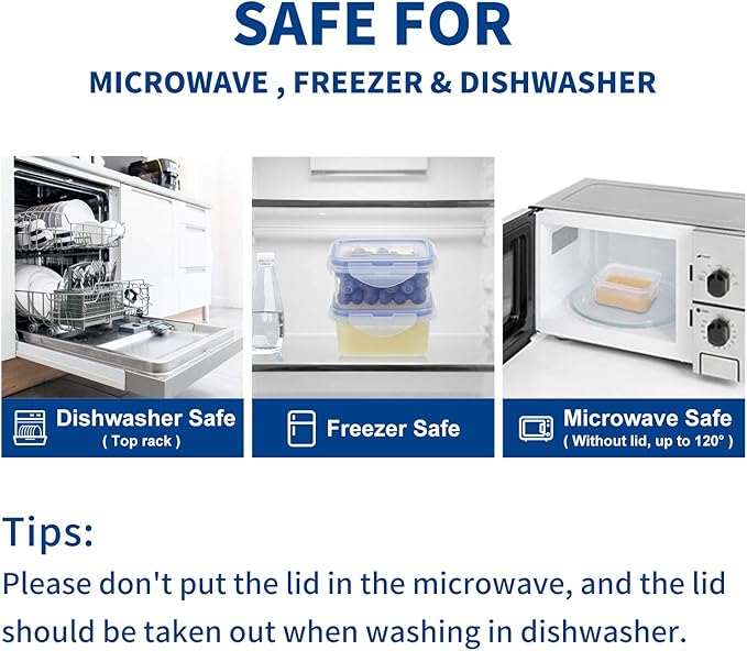 - MICROWAVE,FREEZE,DISHWASHER SAFE:Our containers can tolerate rapid temperature changes from -4℉ to 248℉.Kindly suggest that you should remove the lids before using in microwave and dishwasher.