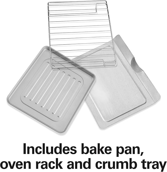 - INCLUDES ACCESSORIES: The oven has 2 rack positions and comes with a bake pan for toasting and baking, an oven rack for broiling and a slide-out crumb tray. When broiling foods on the oven rack, the bake pan rests on the supports below to catch drippings.