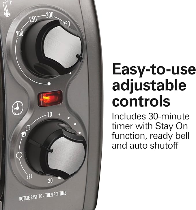 - EASY-TO-USE ADJUSTABLE CONTROLS: This toaster oven has simple manual controls that are great for anyone who wants a toaster oven that gets the job done without being complicated. Includes 30-minute timer with Stay On function, ready bell and auto shutoff.