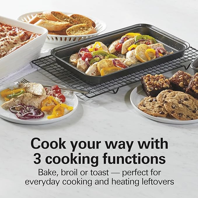 - COOK YOUR WAY WITH 3 COOKING FUNCTIONS: The countertop oven gives you the versatility to bake, broil and toast. It has temperature options ranging from 200-450°F — great for everyday tasks like heating leftovers, broiling chicken breasts and making toast.