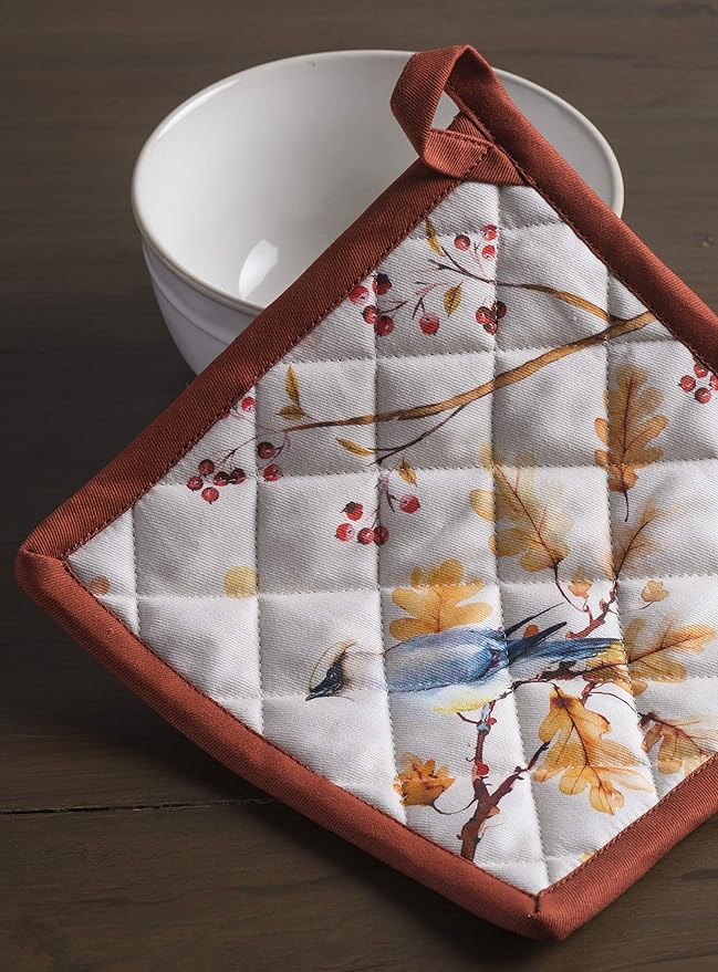 Maison d' Hermine 100% Cotton Oven Mitt & Pot Holder Set (7.5"x13" & 8"x8") Heat Resistant BBQ Cooking Gloves with Loop for Thanksgiving Christmas Decorations Handling Hot Pans (Oak Leaves)