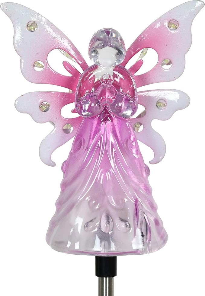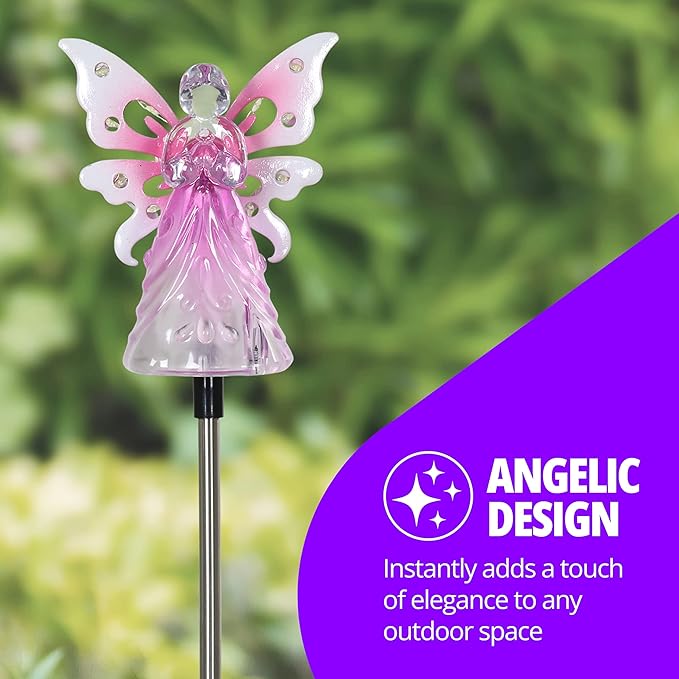 Exhart Garden Solar Lights, Decorative Angel Garden Stake, 12 LEDs, Cute Yard and Pathway Decor, Pink, 4 x 34 Inch