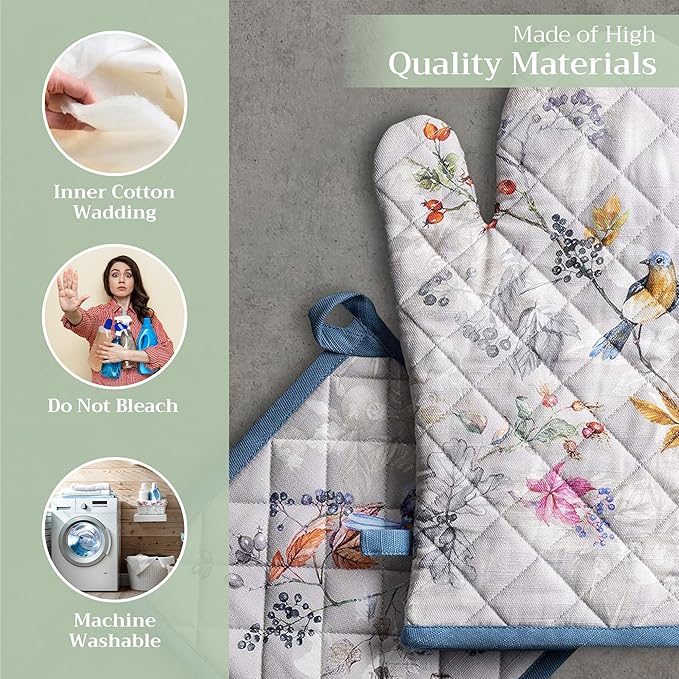 - Premium Quality: Crafted from quilted 100% cotton, this heat-resistant oven mitt and pot holder set protects your hands from hot cookware. Each piece features a built-in hanging loop for easy storage and quick access. This versatile set is perfect for everyday home kitchens, farmhouse kitchens, hotels, restaurants, and bakeries