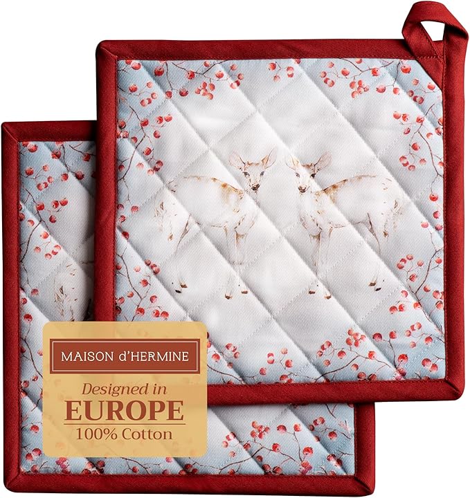 - Package Includes: Set includes 2 pot holders measuring 8" x 8", perfect for handling hot pots, pans, and dishes safely. Made from 100% cotton for reliable heat protection and durability. Designed in Europe and made in India