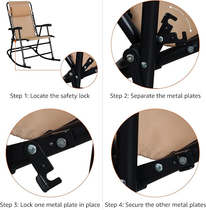 Amazon Basics Outdoor Patio Folding Reclining Lounge Rocking Chair with Pillow, Affordable Folding Chairs for Outside, Beige, 33.6 x 37.4 x 26 inch