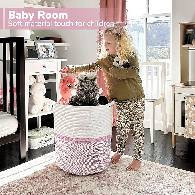 - Unique Color: A pink mixed white woven hamper with excellent workmanship, both decoration and organization function. Our nursery storage basket perfect for placing in nursery room, kid room, girl room to save extra spaces. Just put it in your washing machine, which will not scratch the surface, you will get a new one after washing