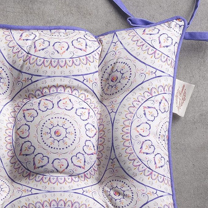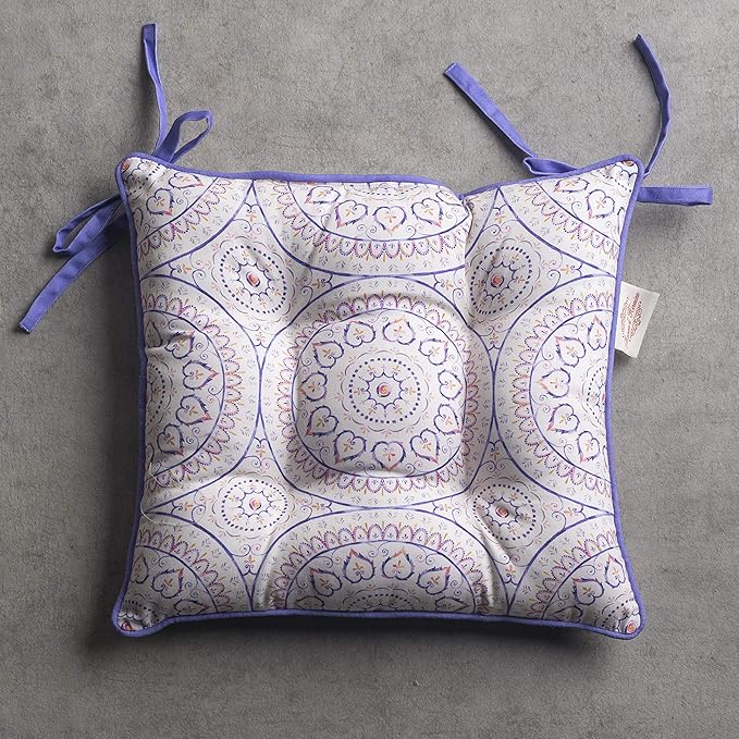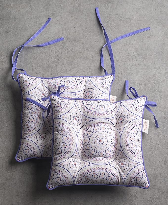 - Complete Package: Set includes 2 cotton chair cushions with ties, each 16"x16". Designed in Europe and made in India, these decorative seat pads add comfort and charm to any chair in your home