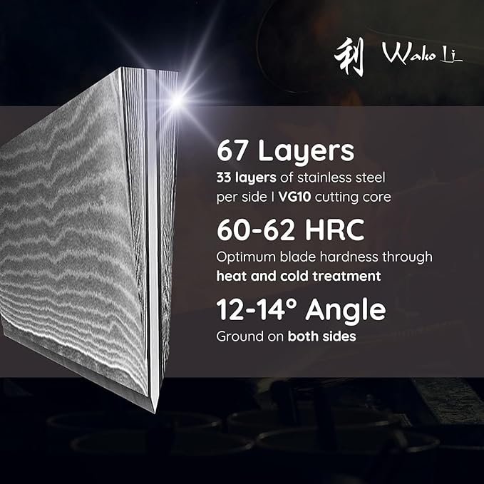 - Ergonomic Handle: Experience unparalleled comfort with our professional kitchen knives, featuring handles made from strong and robust Pakkawodd. The ergonomic design ensures perfect balance and a comfortable grip, making these knives ideal for both professional chefs and hobby cooks. Say goodbye to hand fatigue with the Wakoli chef knife set, crafted for ease and precision in every slice