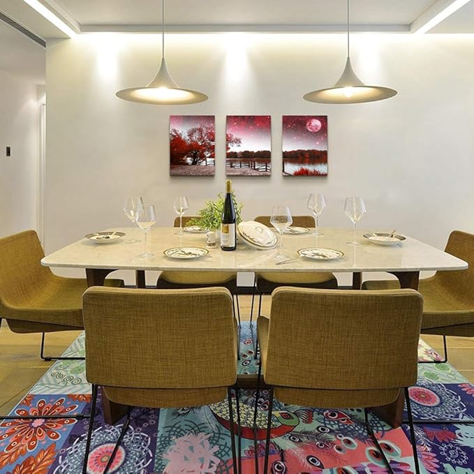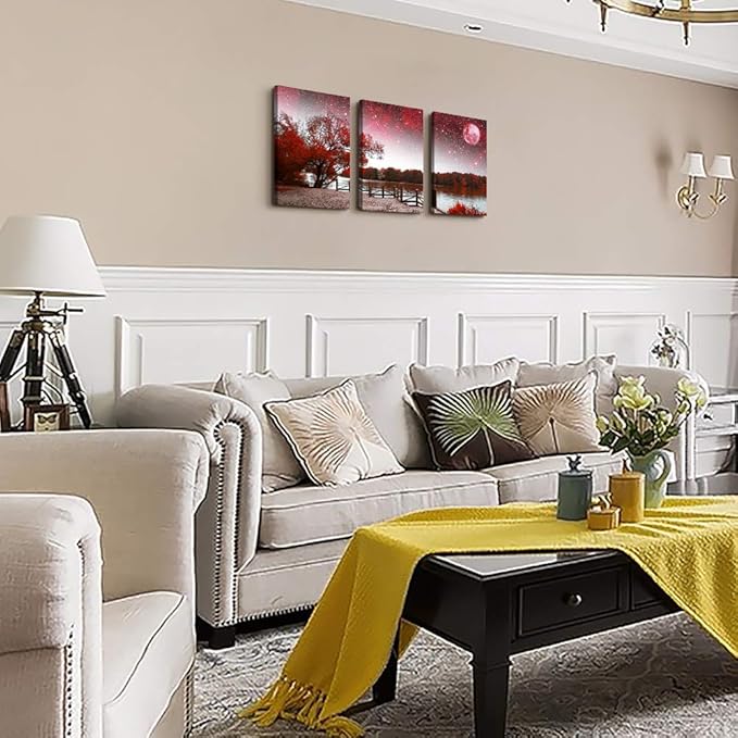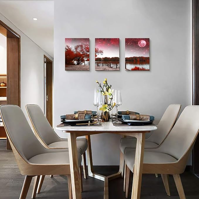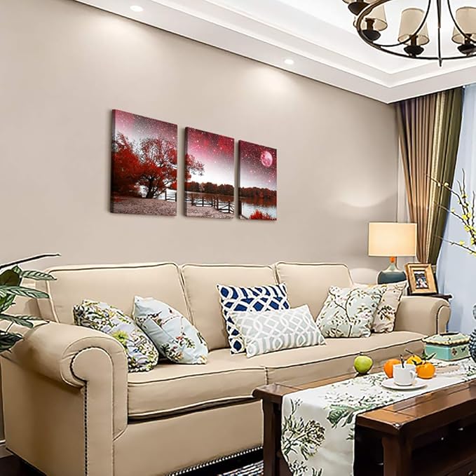 Wall Art Decor Poster Living Room abstract Red Tree Moon Starry Sky red Landscape Painting Bathroom Wall Art Bedroom Canvas Prints 3 Pieces Picture Works Ready to Hang Office Home decoration Artwork
