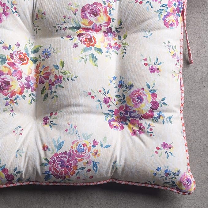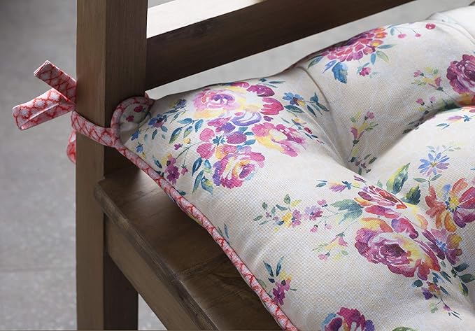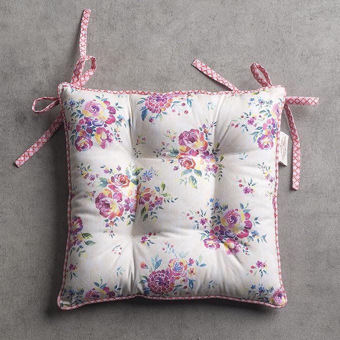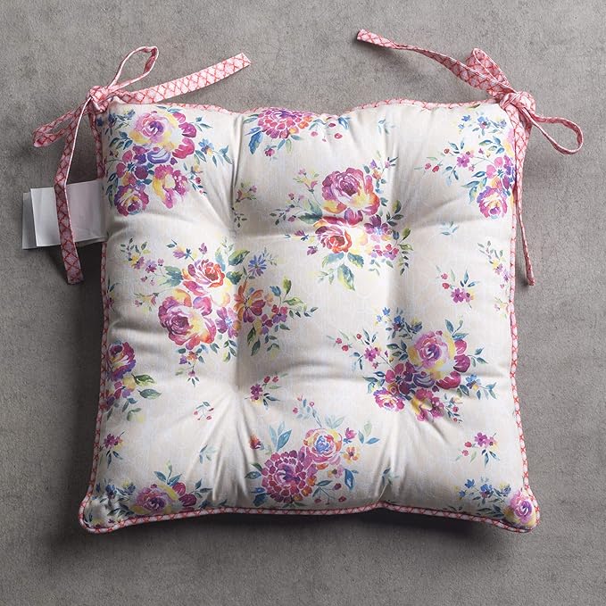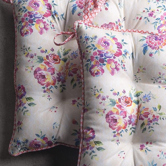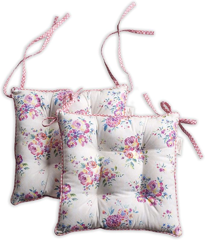 - Complete Package: Set includes 2 cotton chair cushions with ties, each 16"x16". Designed in Europe and made in India, these decorative seat pads add comfort and charm to any chair in your home