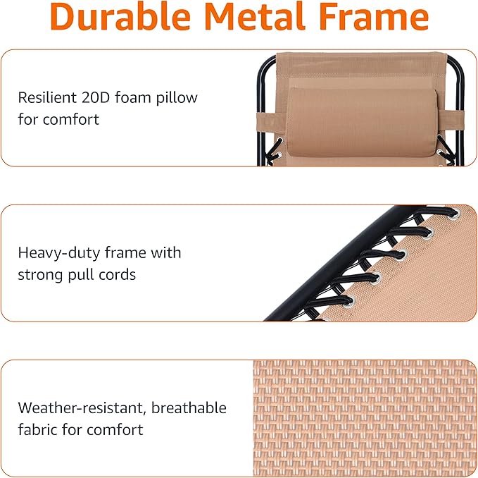Amazon Basics Outdoor Patio Mesh Adjustable Zero Gravity Lounge Chair Recliners set of 2 with Side Table, 35 x 26 x 43 inches, Beige