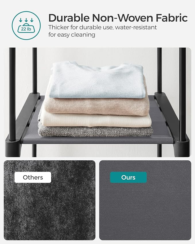 - [It Has the Strength] The 0.4 mm thick hanging rods have a load capacity of 66 lb each and the fabric shelf holds up to 22 lb because it’s supported by four 0.6" dia. metal tubes and strengthened double-sided connectors