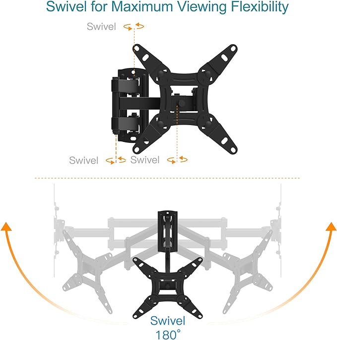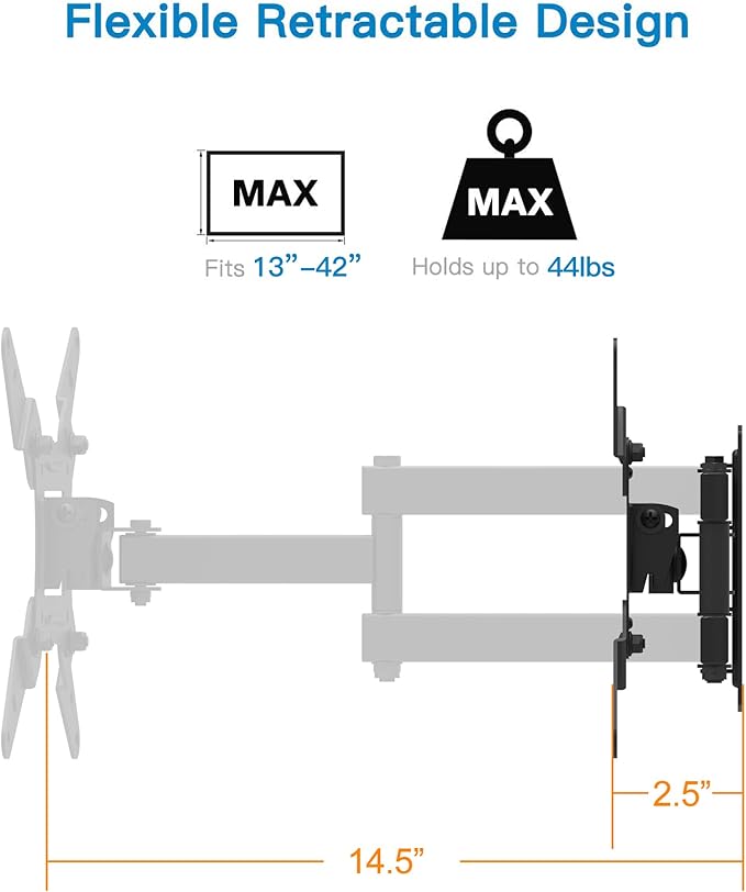 - π Viewing becomes more comfortable: tilts display up 5Β° and down 15Β° to reduce glare, swivels display left or right according to your seats position. (max. Swivel angle depends on TV size) 360Β°rotation.Pull out Tv bracket to 14.5β and retract back to 2.5β, making your display alive to move.