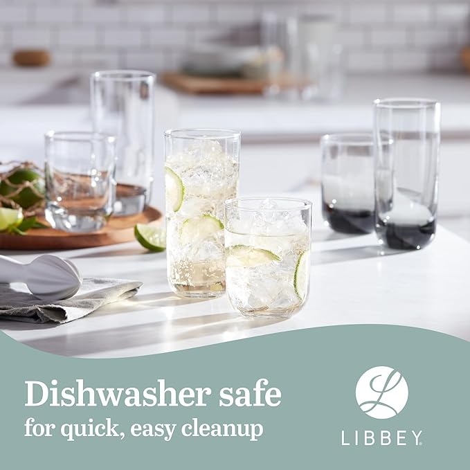 Libbey Polaris Tumbler and Rocks Glass Set, Smoke Hue Drinkware Glasses Set, Lead-Free Tall Water Glasses with Modern Clean Lines, Dishwasher Safe Drinking Glasses Set of 16
