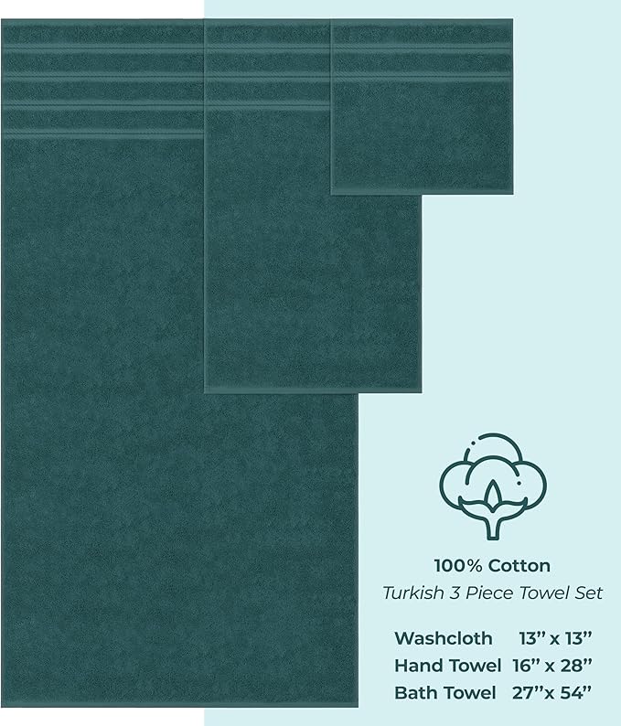 - ✅ Turkish Premium 3 Piece Towel Set Includes 1 Bath Towel of 27 x 54 inches, 1 Hand Towel of 16 x 28 inches and 1 Washcloth of 13 x 13 inches.