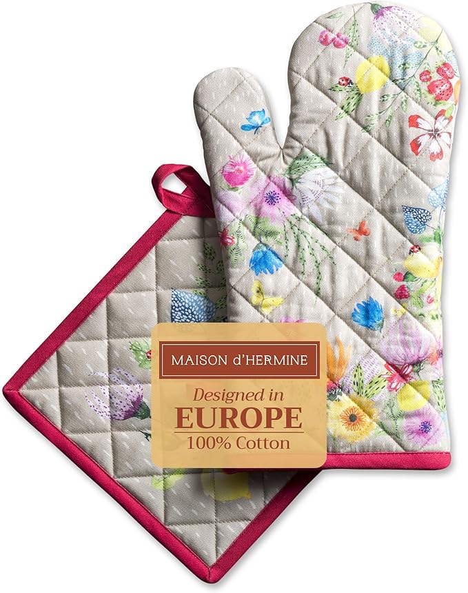 Maison d' Hermine 100% Cotton Oven Mitt & Pot Holder Set (7.5"x13" & 8"x8") Heat Resistant BBQ Cooking Gloves with Loop, Baking, Grilling, Kitchen, Handling Hot Pans Spring/Summer (Jardin D'Ete - Fog)