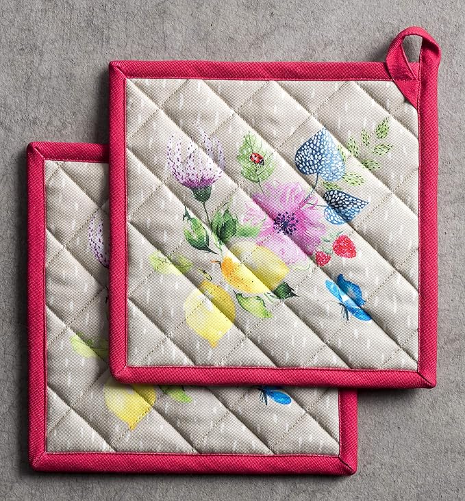 Maison d' Hermine Pot Holders Set 100% Cotton Heat Resistant Potholders 8" x 8" Hot Pads with Loop BBQ, Cooking, Grilling, Kitchen, Handling Hot Pans Spring/Summer (Pack of 2, Jardin D'Ete - Fog)