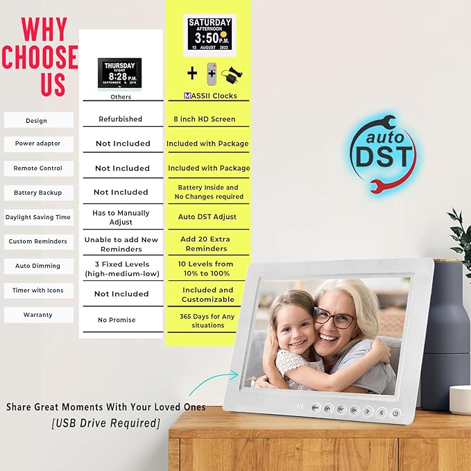 MASSII 8 Inch Extra Large Upgraded Dementia Clock 19 Alarms with Auto DST, 20 Custom Reminders,10-Level Auto Dimmer, 6 Display Modes, Digital Clock with Date and Time, 8" White with Remote