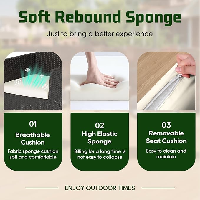 - COMFORTABLE & STYLISH DESIGN: This patio set has thick, high-density rebound sponge cushions for cozy seating. Its simple, stylish look suits patios, balconies, poolside, or gardens.