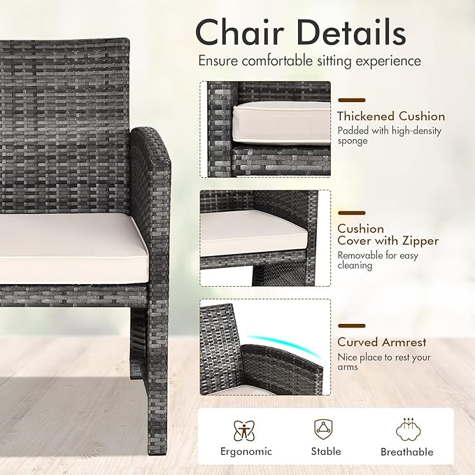 - 【Sturdy & Durable】This patio conversation set is made of high-quality PE rattan which has strong toughness and superior load-bearing performance, not easy to break after long time use. It’s waterproof and UV-resistant, which can prevent damping, fading and cracking. Solid powder-coated steel frame and skid-resistant footpads also ensure overall stability.