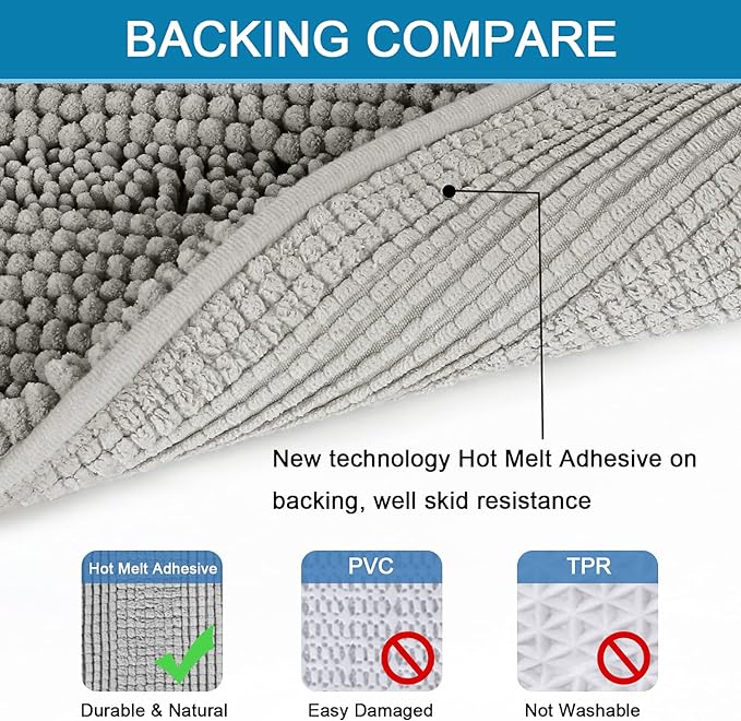 - ULTRA THICK: These bath rugs are passed GLOBAL RECYCLED STANDARD certificate. Compare the normal quality 1350g/sm, this plush chenille carpet set is more thick and bushy, quality up to 2000g/sm weight, thus make the bath mats amazing soft and cozy like a comfortable quilt protector for your feet