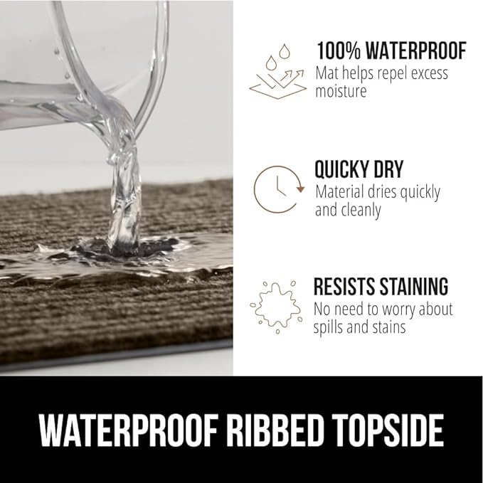 - WATERPROOF RIBBED TOPSIDE: ultra absorbent and 100% waterproof, the mat's surface helps to capture excess water and moisture; plus, premium fabric dries quickly and resists staining and fading for long lasting use