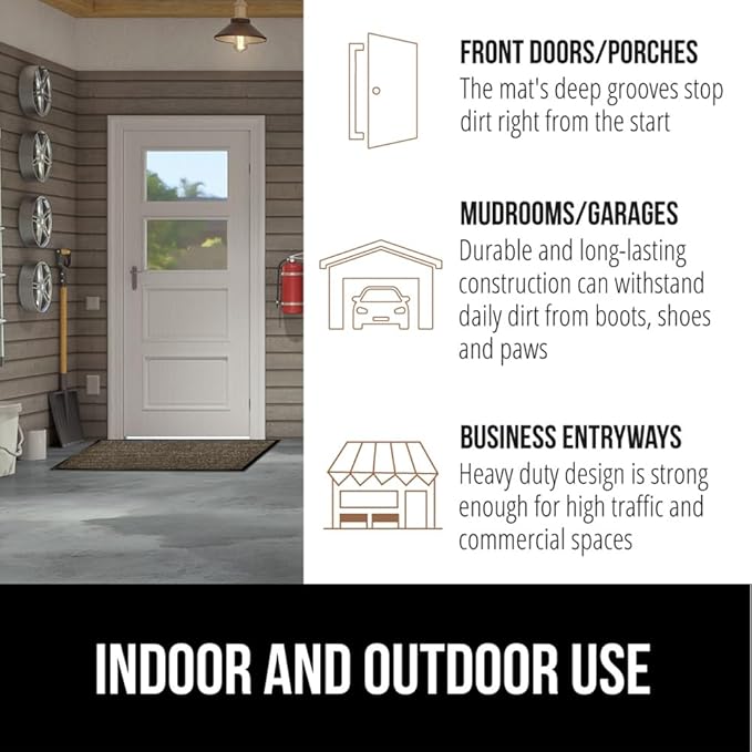 - INDOOR AND OUTDOOR USE: a great option for both indoors or out; mat's are extremely durable and can be used in a variety of locations at home or at work such as entryways, porches, patios, mudrooms, garages, and more; measuring 35 by 23 inches for a perfect fit